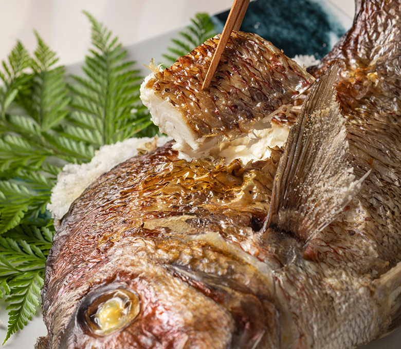 丁寧に焼き上げた尾頭付きの鯛は、香ばしい皮目とふっくらとした身が絶妙で、上品な旨みが口いっぱいに広がります。
